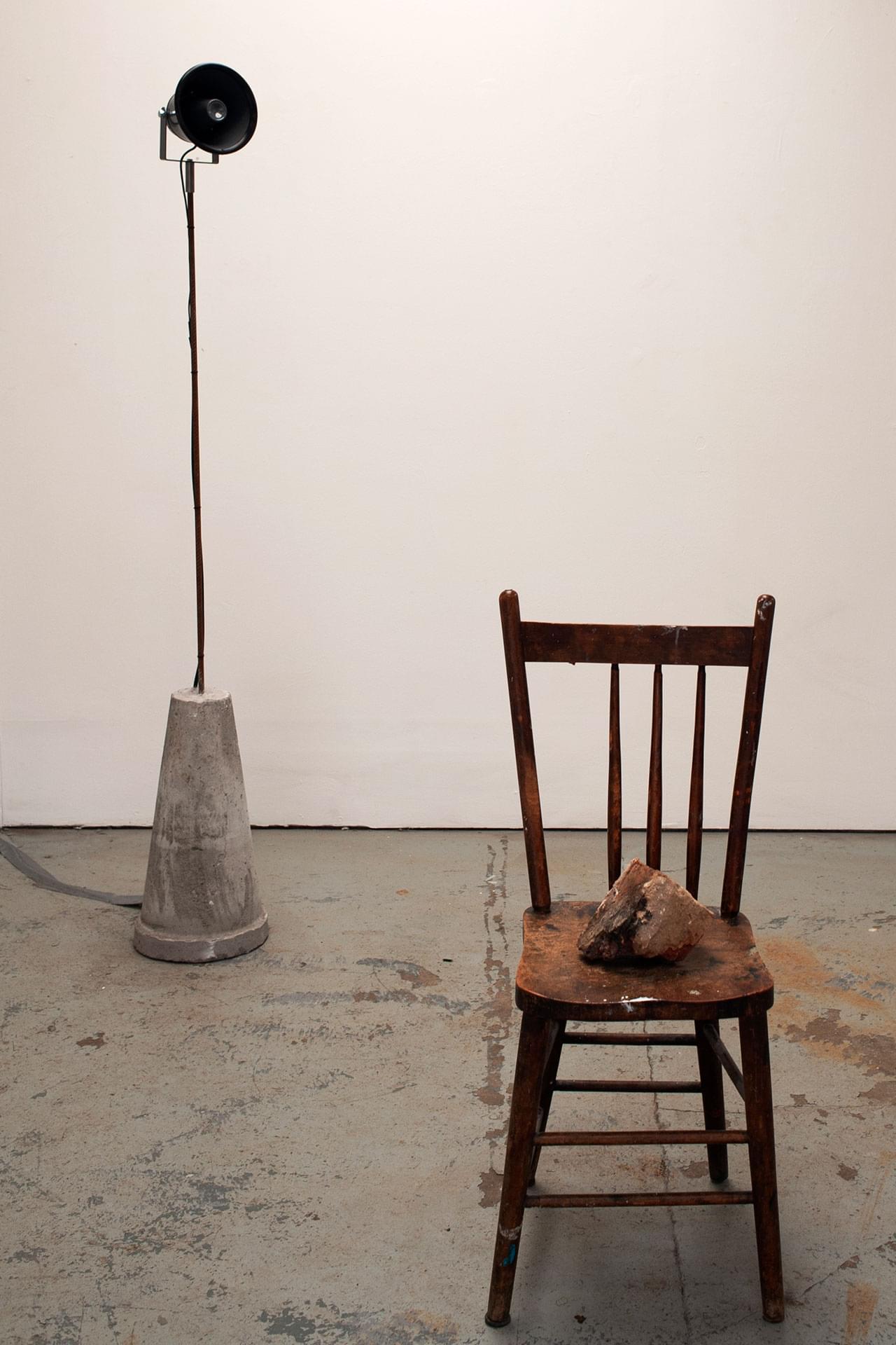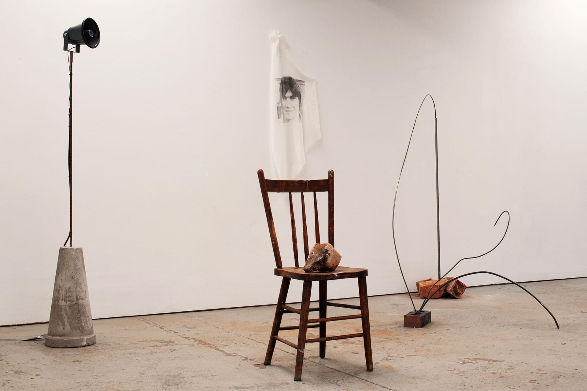 Materials: Wood, Concrete, Metal, Bricks, Chair, Sound, Horn speaker, Screen-printed photograph on fabric.