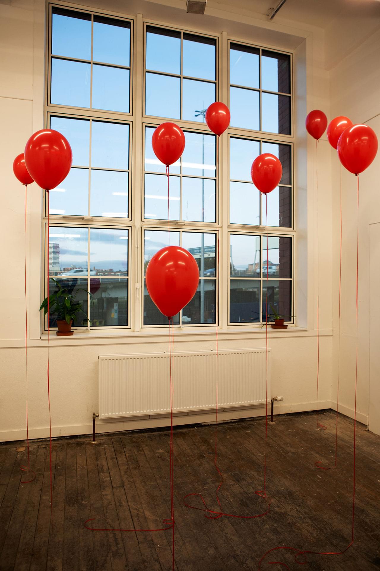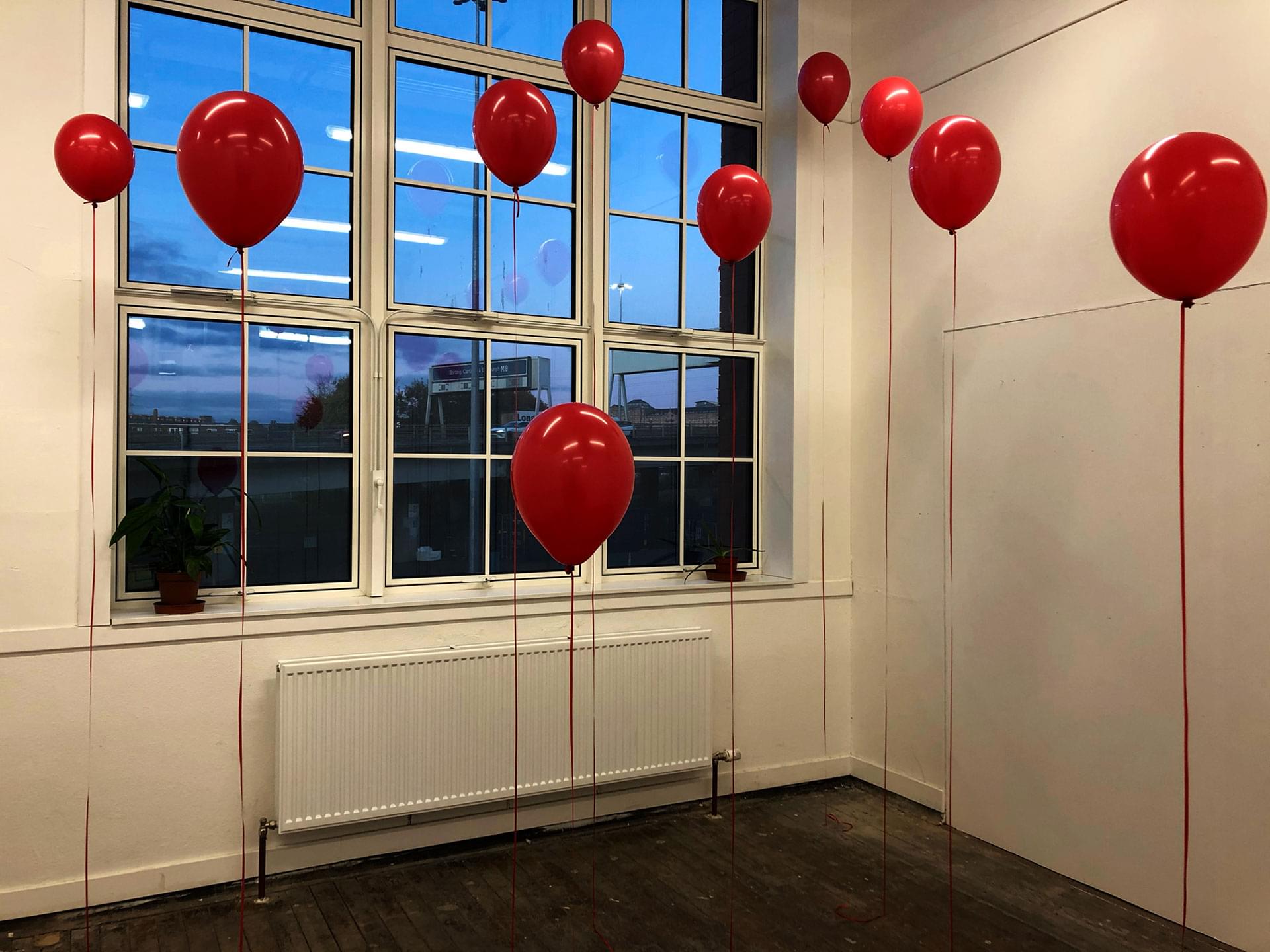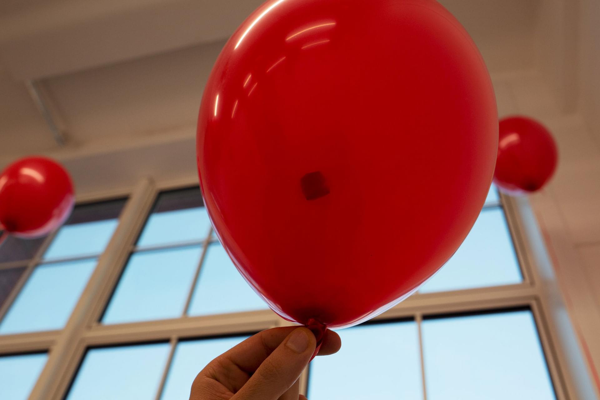 Materials: 10-inch Red Latex Balloons, Helium, Air, Text, Red Ribbon