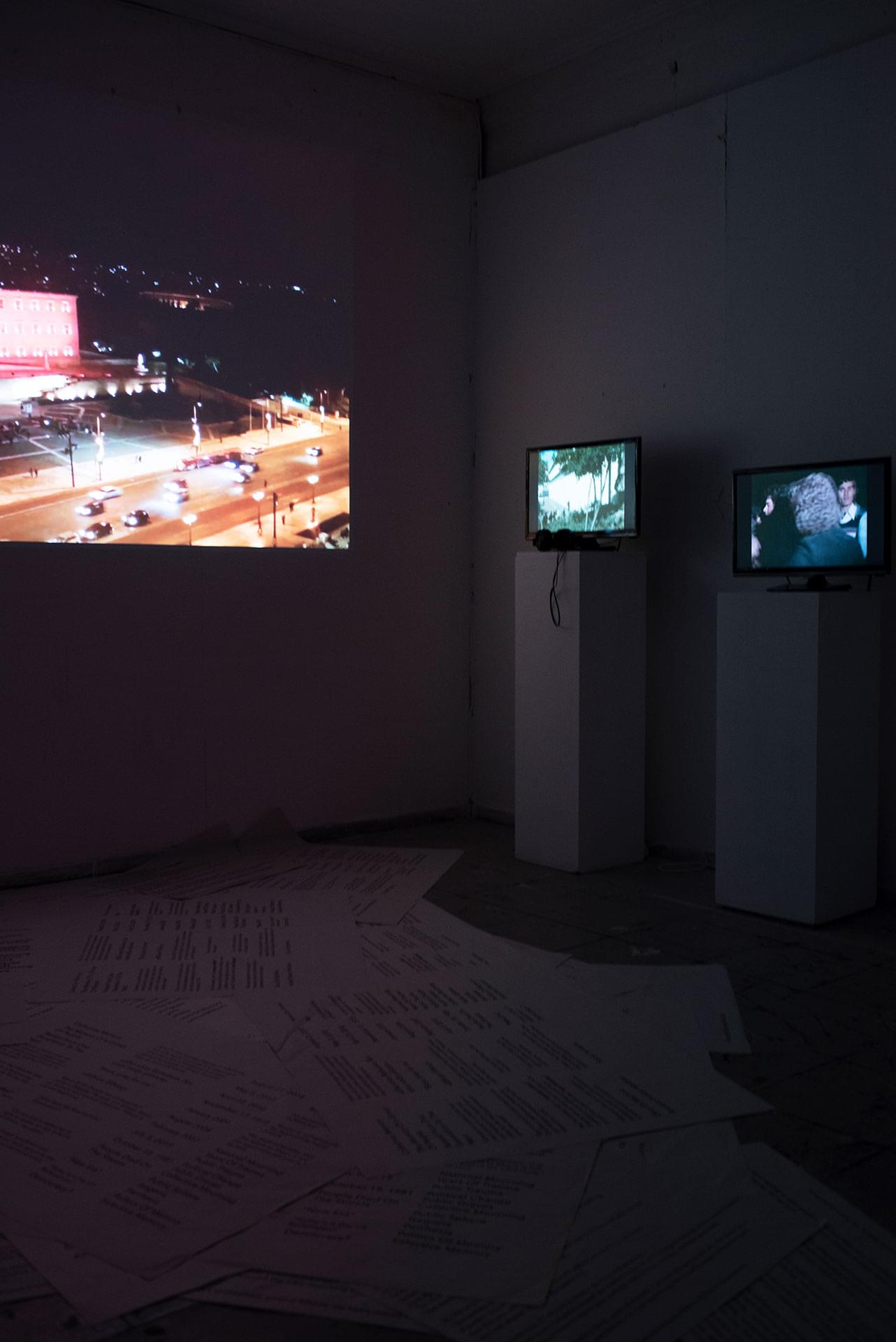 Materials: Found Footage, Audio, 3 Samsung Monitors, Plinths, Text, CCTV, Sound speakers, Projector